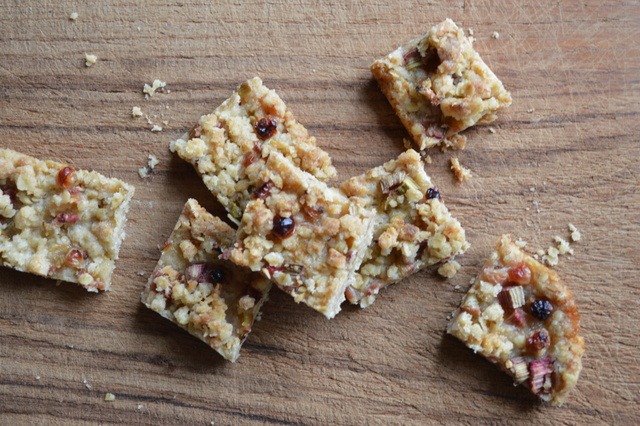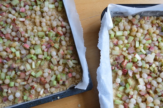 Rhabarber und Johannisbeeren mit dem Maizena mischen. Auf der Masse verteilen. Den Rest der Haferflocken-Mischung darüber „streuseln“ und ab in den Ofen: Ungefähr 30 bis 40 Minuten bis alles schön braun und knusprig ist. Etwas abkühlen lassen und danach in Stücke schneiden.
