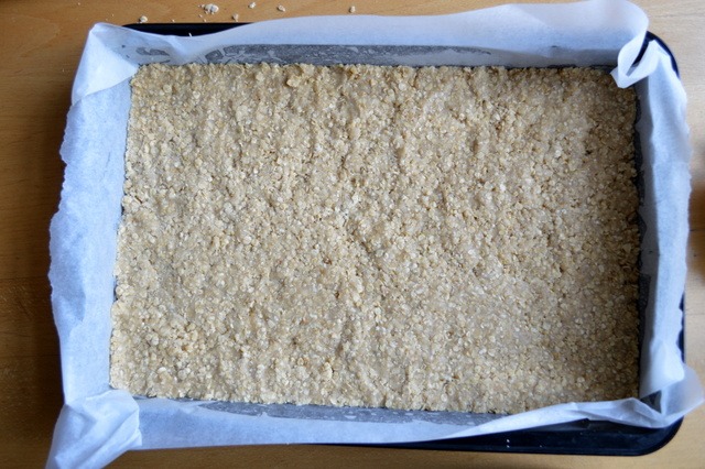 Eine Form (ca. 20x35cm) mit Backpapier auslegen. Die Masse fest in die Form drücken, dabei ungefähr einen Viertel zur Seite stellen.