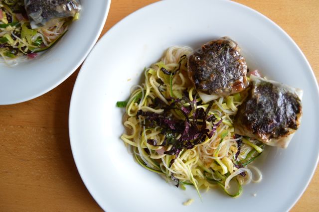 Lauwarme Glasnudeln mit Zucchetti, Auberginen-„Frühlingsrollen“ und Shiso