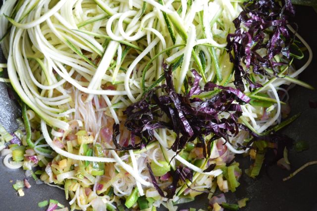 Die Glasnudeln zur Lauchmischung geben, Zucchettistreifen und Sauce hinzufügen und alles gut durchmischen. Mit dem Shiso bestreuen und mit den Auberginen-Frühlingsrollen servieren.