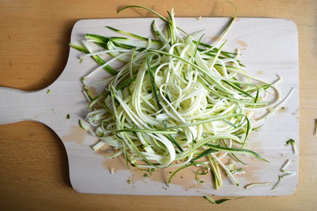 Die Zucchetti mit einem Julienne-Schneider in lange Streifen hobeln. Die Shiso-Blätter in feine Streifen schneiden.
