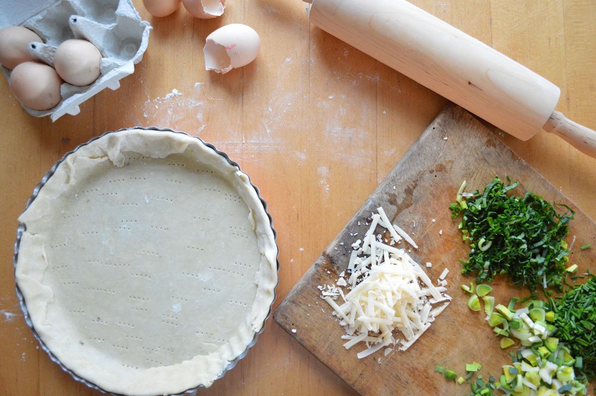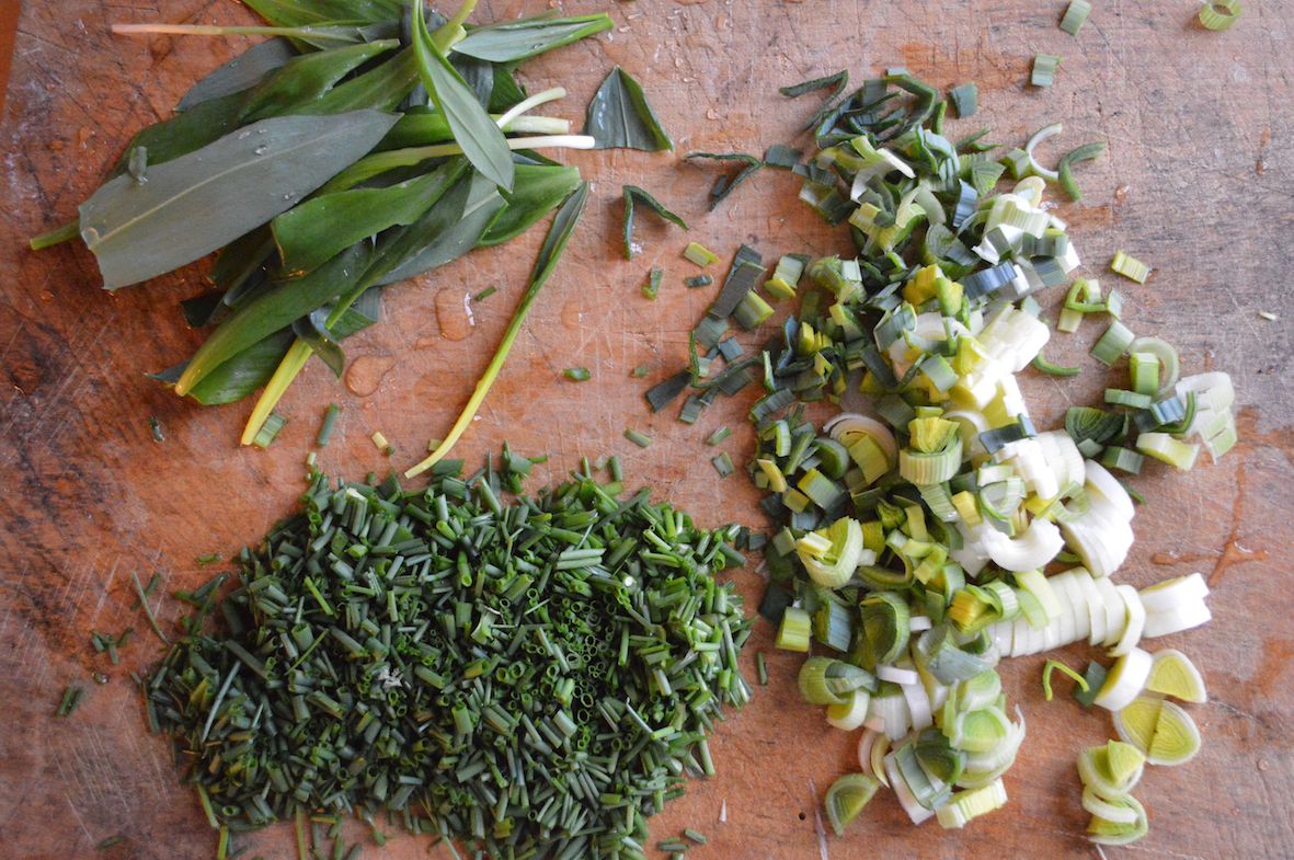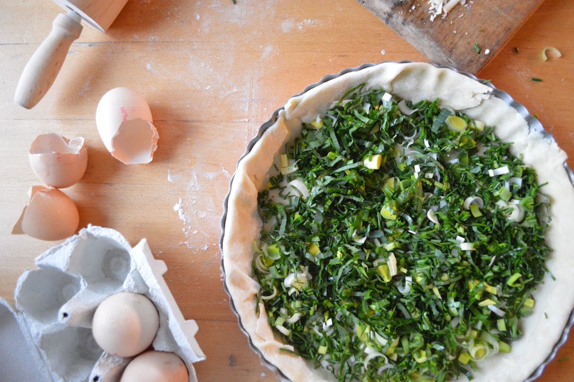 Für die Füllung den Lauch, Schnittlauch und Bärlauch in Ringe oder Streifen schneiden. Eier, Milch, Rahm und Gewürze verquirlen.