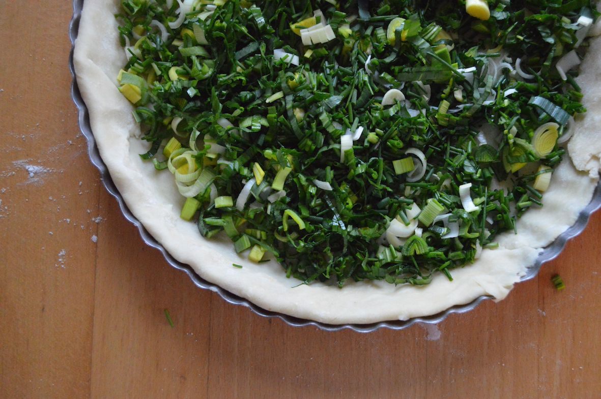 Den Teig dünn auswallen und eine gefettete Quiche- oder Wähenform damit auslegen. Den Teig mit einer Gabel einstechen. Lauch, Schnittlauch und Bärlauch auf dem Teig verteilen, den Käse darüber streuen. Den Guss hinzufügen und die Quiche bei 180°C im vorgeheizten Ofen ungefähr 30 bis 40 Minuten backen.