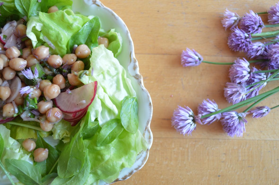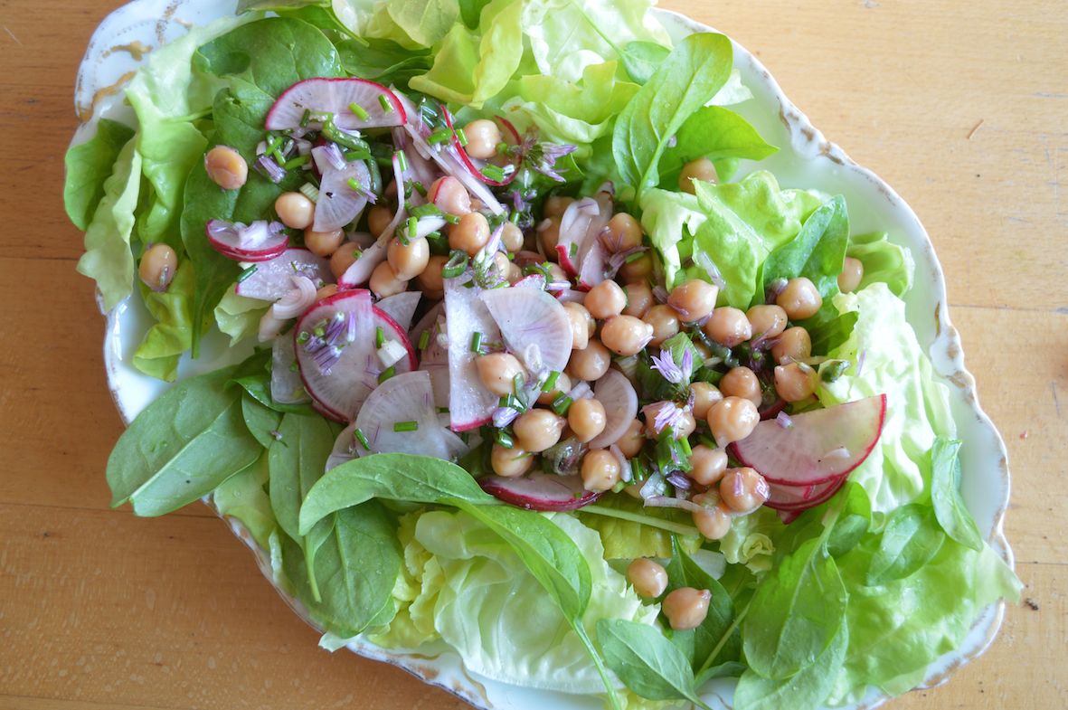 Für diesen Salat werden die Kichererbsen mit allerlei frühlingshaftem Gemüse gepaart, welches im Moment geerntet werden kann (und sich deshalb auch in den Gemüsekisten findet). Hurra – die Gemüseabosaison hat begonnen!