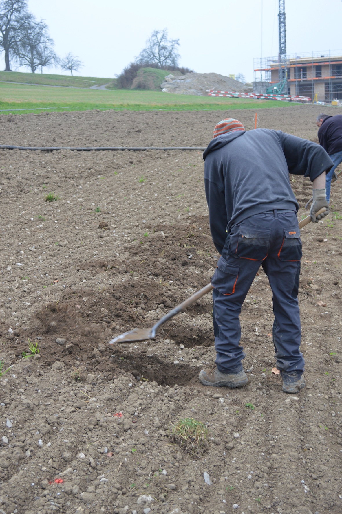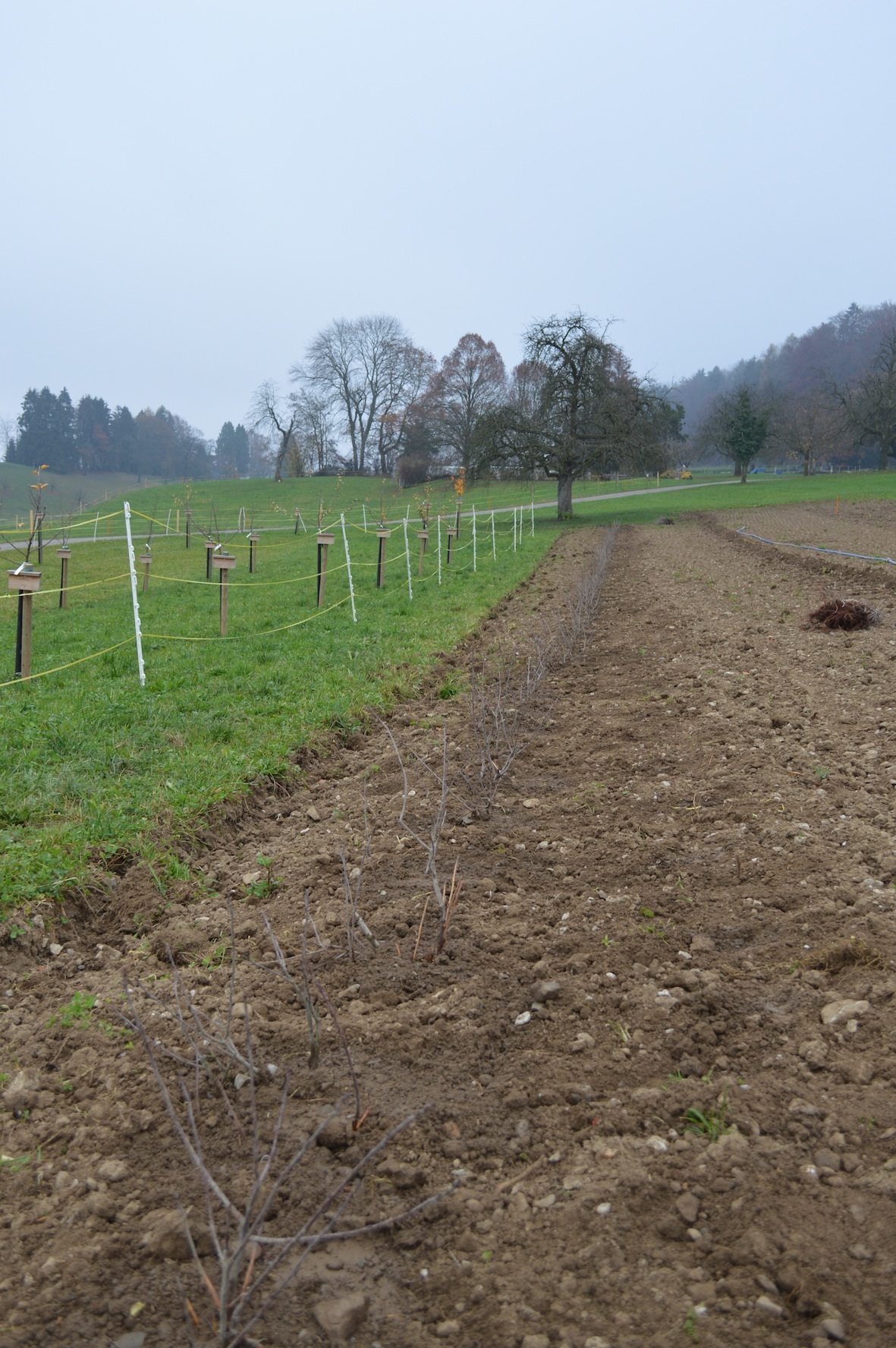 Der Gmüeser hat wieder gepflanzt. 650 Stöcke Aronia werden das Landschaftsbild oberhalb unseres Baumgartens in den nächsten Jahren verändern. Das weisse Blütenmehr im Frühjahr wird eine Insektenweide. Mit ihrer tiefgrünen Blätterfarbe, die sich im Herbst knallrot färbt und den dunkelvioletten Früchten, wird diese Anlage in der Vegetationszeit das Auge immer wieder von neuem überraschen. Im nächsten Jahr wird zudem zwischen den Reihen eine artenreiche Heuwiese angesät.