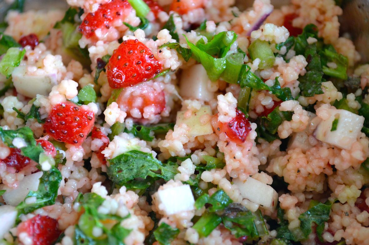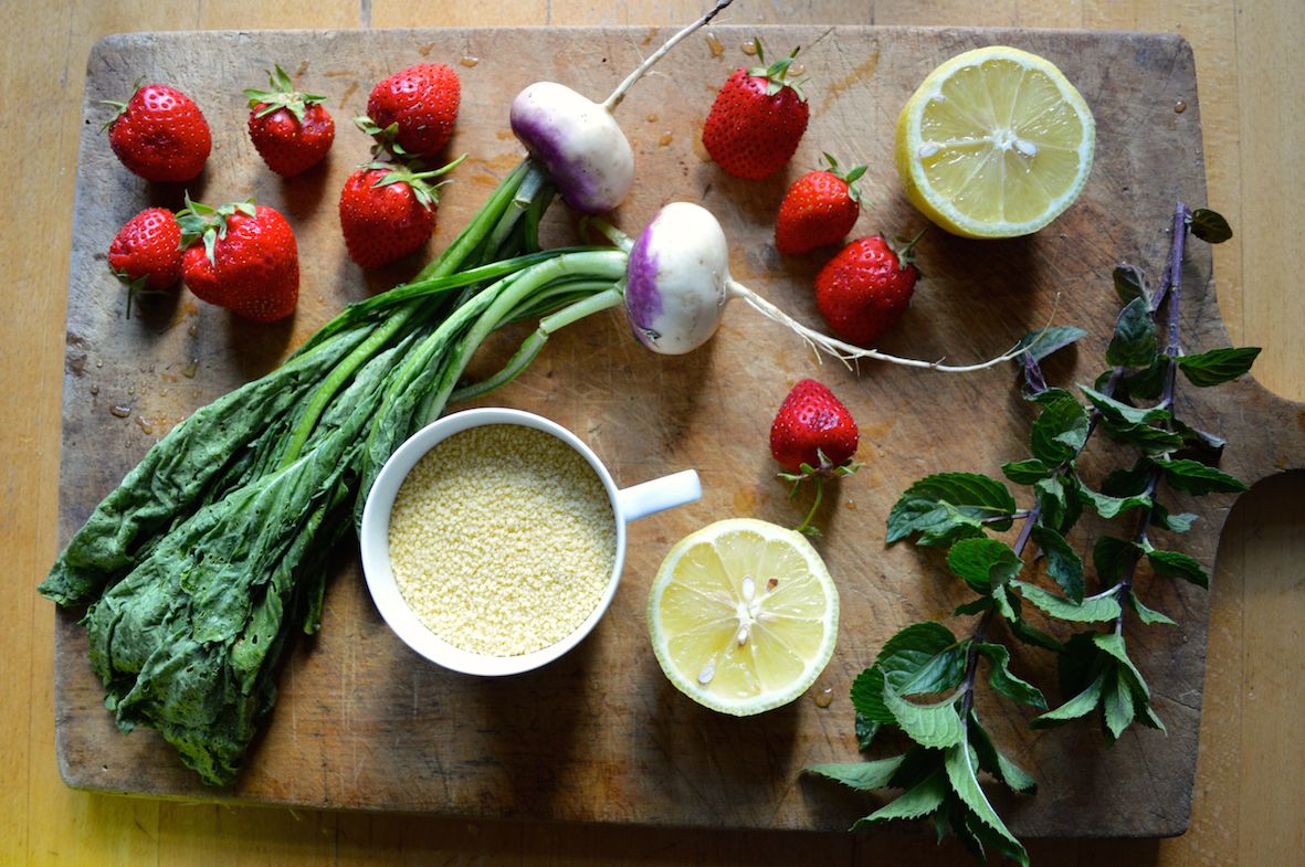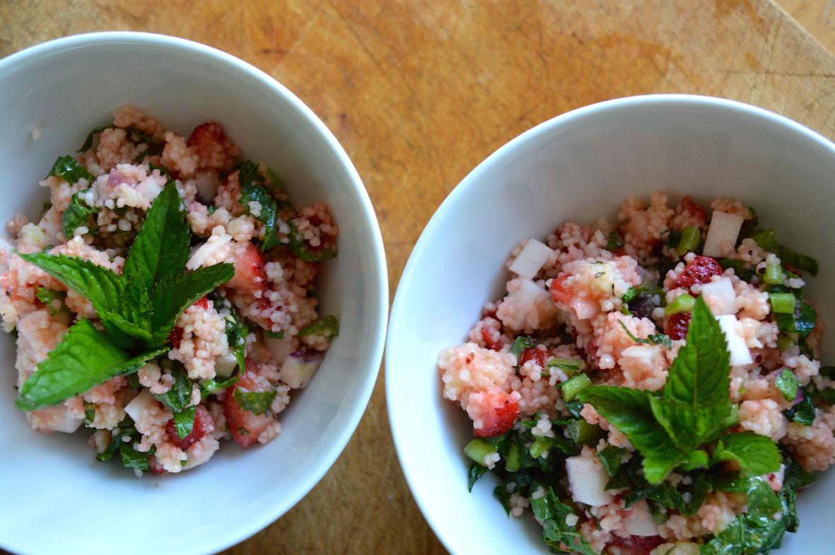 Den erkalteten Couscous mit Zitronensaft, Olivenöl, Mairüben, Erdbeeren und Minze mischen, mit Salz und Pfeffer abschmecken. Mit Za’atar bestreuen und servieren.