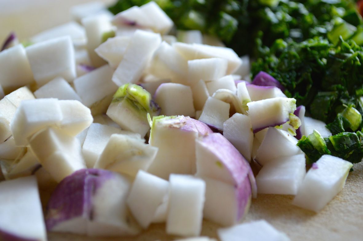 2 Mairüben, wenn möglich mit Kraut (Alternative zum Kraut: Eine Handvoll Spinat)