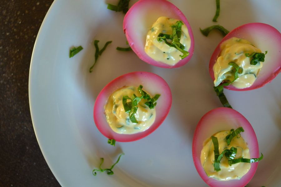 Die gefüllten Eier passen doch perfekt zum kommenden Osterbrunch? Dafür kann man auch gleich den ersten Bärlauch verwenden. Aber es gibt natürlich noch viele andere Möglichkeiten: Als bunter Farbtupfer auf einem Nüsslisalat, in einem Sandwich mit farblich passenden Rettichsprossen, als rosafarbenes Eierbrötli, und und und…