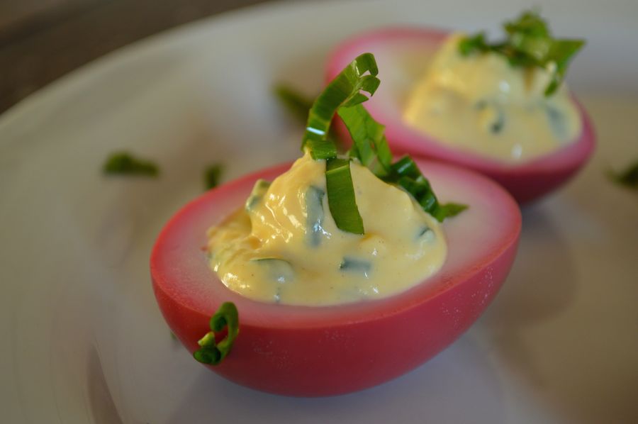 Die gefüllten Eier passen doch perfekt zum kommenden Osterbrunch? Dafür kann man auch gleich den ersten Bärlauch verwenden. Aber es gibt natürlich noch viele andere Möglichkeiten: Als bunter Farbtupfer auf einem Nüsslisalat, in einem Sandwich mit farblich passenden Rettichsprossen, als rosafarbenes Eierbrötli, und und und…