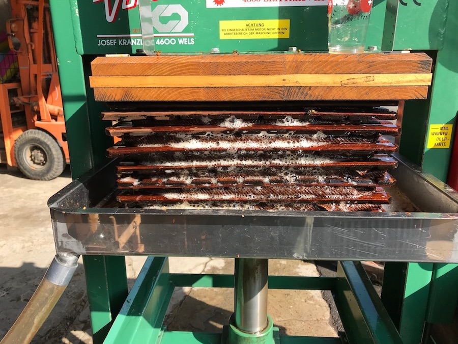 Unsere Kernobstbäume tragen viele Früchte und sind schon einige Wochen früher reif als üblich. Zudem sind die Äpfel und Birnen eher klein, was der anhaltenden Trockenheit der vergangenen Monate geschuldet ist. Der fehlende Niederschlag zeigt sich beim Mosten noch auf eine andere Weise. Was in einem ’normalen’ Jahr aus drei gefüllten Harassen gedrückt werden kann, benötigt derzeit beinahe fünf Gebinde!