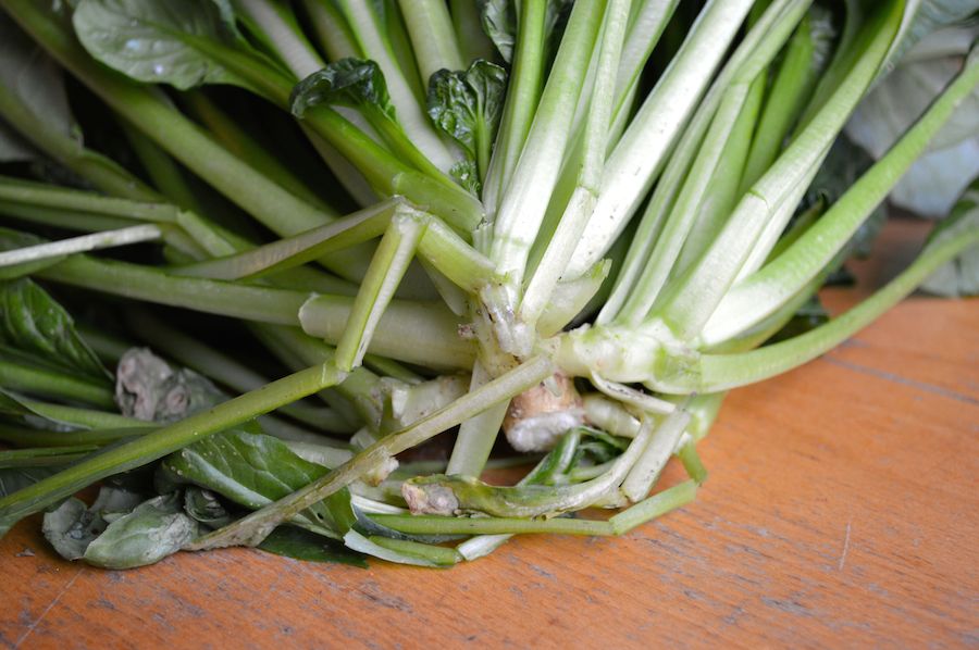 Zwiebeln, Knoblauch, Ingwer und Chili in Öl anbraten. Tatsoi hinzufügen, braten bis er zusammenfällt. Mit Sojasauce würzen.