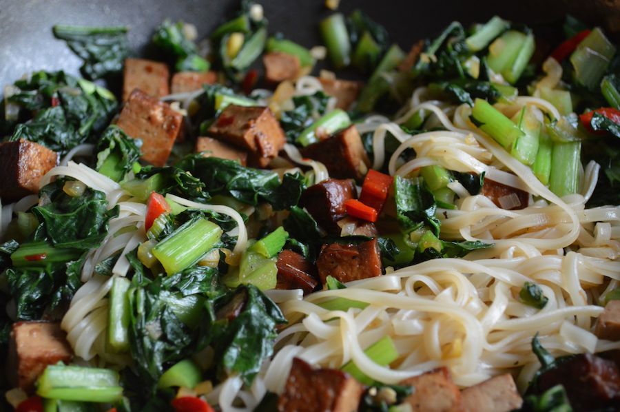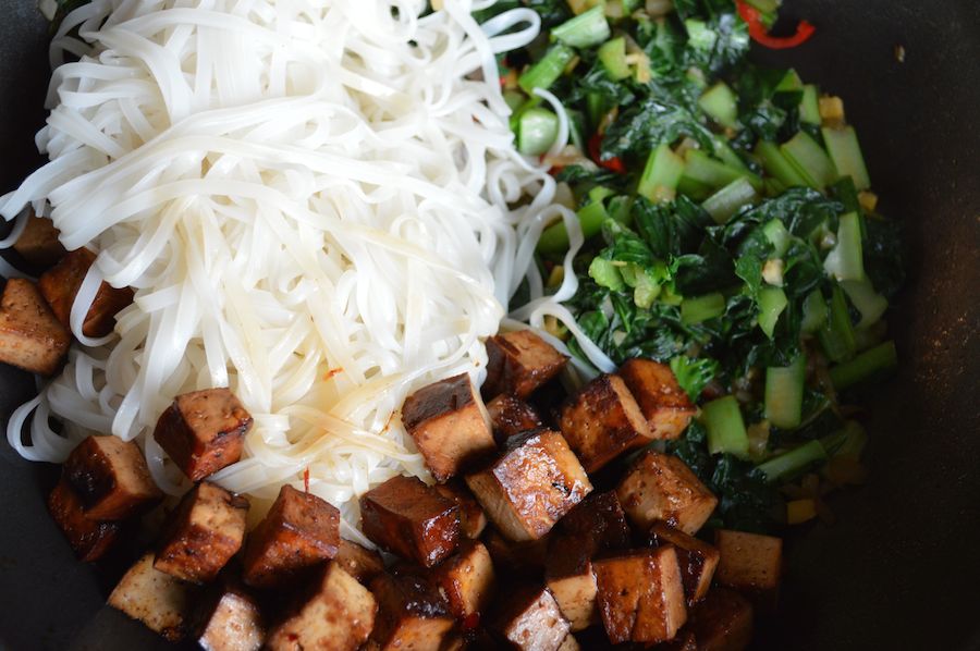 Tatsoi mit Reisnudeln und Tofu mischen. Abschmecken und servieren.