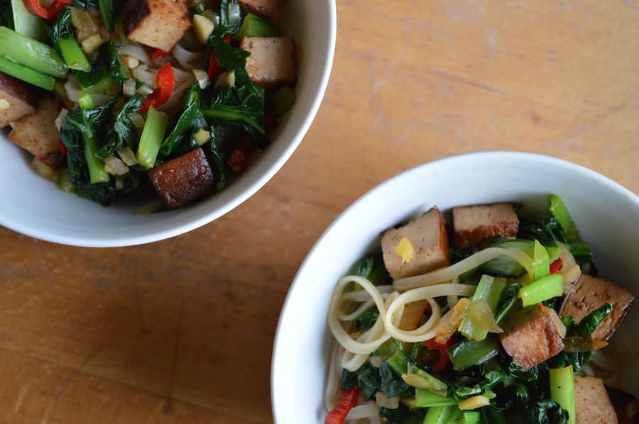 Von seiner Herkunft inspiriert haben wir den Tatsoi mit Chili, Ingwer und Sojasauce gebraten und mit knusprigem Tofu und Reisnudeln gegessen. Lecker!