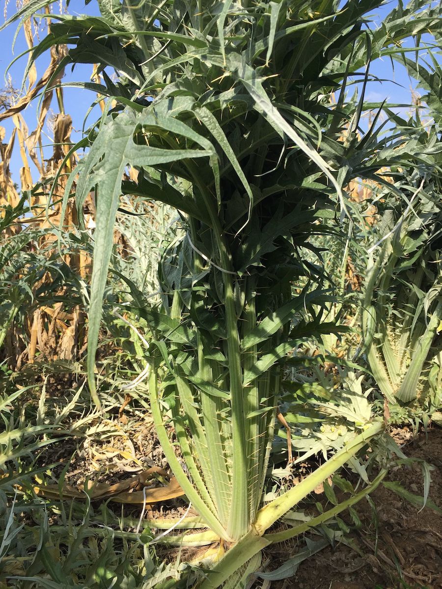 Will man den Kardy ernten, hat er immer noch Stacheln. Zum Glück sind sie nicht mehr ganz so schmerzhaft. Dann rüstet man den Kardy. Und wenn man die faserige Haut abzieht, bekommt man eine Ahnung, weshalb man die ganze Sache auf sich genommen hat: Es riecht wunderbar fein nach Artischocken.