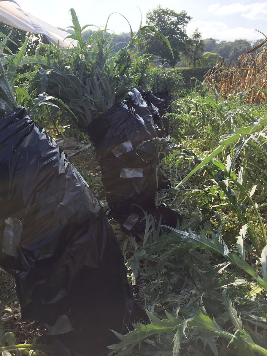 Es gibt Gemüsesorten, die machen es einem nicht leicht, sie zu mögen. Dazu gehört für mich Kardy. Seine Stacheln sagen uns: Lass mich in Ruhe! Trotz seiner Stacheln muss man ihn im Herbst zusammenbinden und mit einer Plastikfolie einwickeln, denn die Stängel müssen gebleicht werden, bevor man sie essen kann. Ich weiss nicht, wie viele Stachel wir aus unseren Handschuhen, Jacken und Hosen gezogen haben. Wobei die Handschuhe meistens gar nichts nützten…