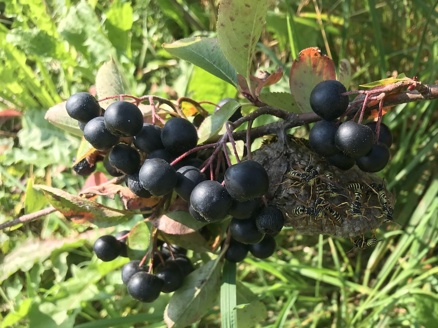 Bleiben wir doch gleich noch bei den Wespen. Dieses Jahr hatte es nicht ausgeprägt viele Wespen. Beim Aroniaablesen musste ich dennoch einige dieser Nester entfernen, damit die Arbeit überhaupt möglich war. Es ist immer wieder spannend, sich diese fragil wirkenden und doch recht robusten Konstruktionen aus der Nähe anzuschauen.