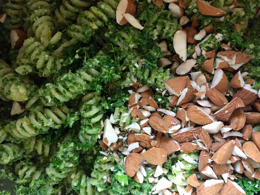 Gekochte Pasta mit dem Pesto, Federkohlstreifen und Mandeln mischen. Mit Parmesan servieren.
