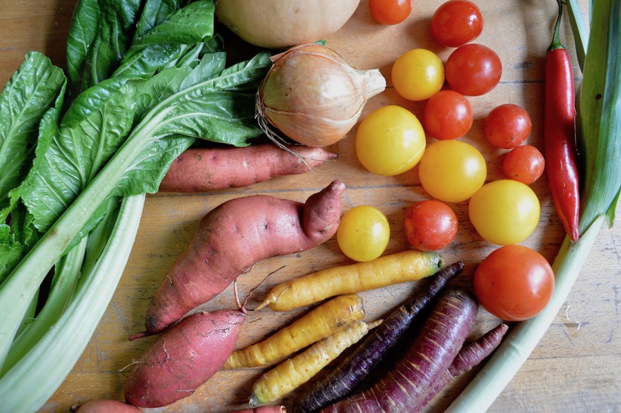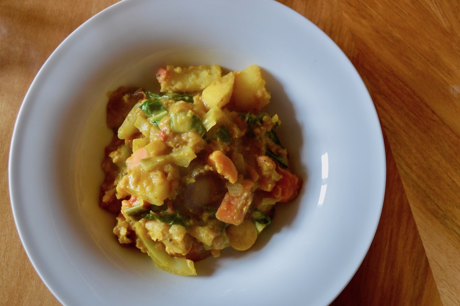 Für diesen Eintopf habe ich Süsskartoffeln verwendet – nächste Woche gibt es auch welche im Abo! Das Rezept dient als Richtlinie und eignet sich sehr gut, um verschiedenes Gemüse zu verwerten – statt Süsskartoffeln kann man „normale“ Kartoffeln oder Kürbis verwenden, statt Rüebli eignen sich auch Sellerie oder Pastinaken sehr gut. Frische Tomaten gibt es nicht mehr lange – als Ersatz kann man Tomaten aus der Dose verwenden. Ich füge gerne noch etwas „Grünes“ hinzu, hier ein paar Rippen eines Pak Choi, der noch im Kühlschrank lag. Auch Krautstiel, Schnittmangold, Spinat oder Federkohl schmecken fein.