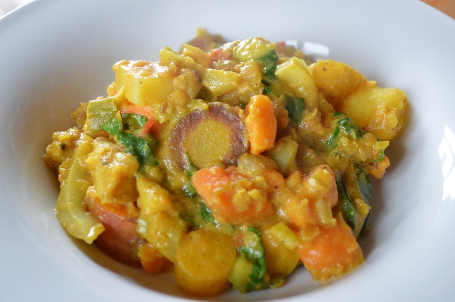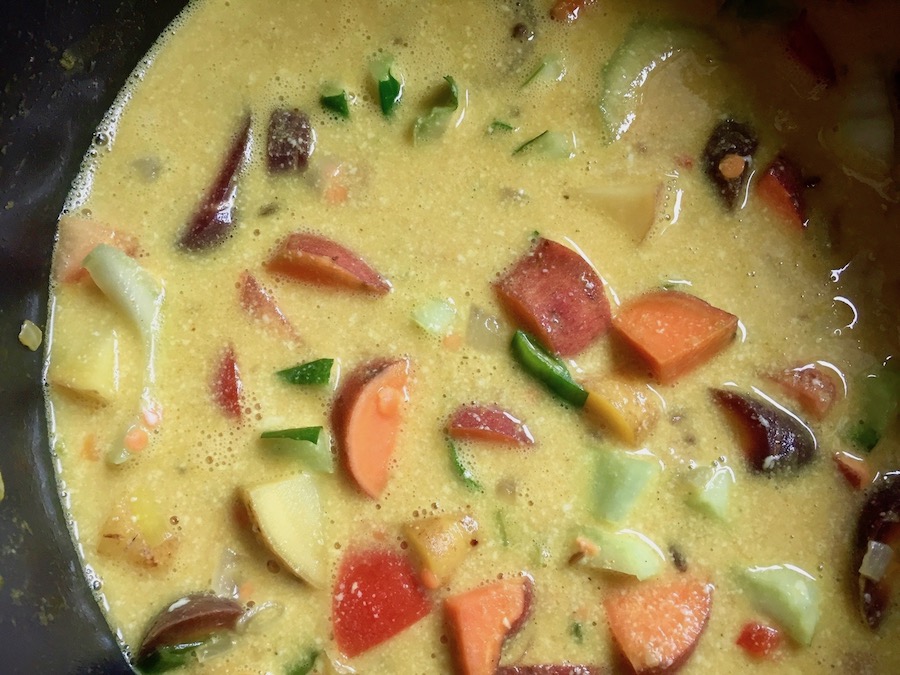 Das Gemüse bis auf das Grün des Pak Choi hinzufügen, alles einige Minuten anbraten, salzen. Kokosnussmilch hinzufügen. Die Dose mit Wasser füllen und dieses ebenfalls zum Gemüse giessen. Die Linsen hinzugeben. Mit Salz, Pfeffer, Kurkuma würzen und mindestens 20 Minuten kochen lassen, bis alles gar ist. Wenn zuwenig Flüssigkeit vorhanden ist, etwas Wasser hinzugiessen. Kurz vor dem Servieren das Pak-Choi-Grün hinzugeben und zusammenfallen lassen.